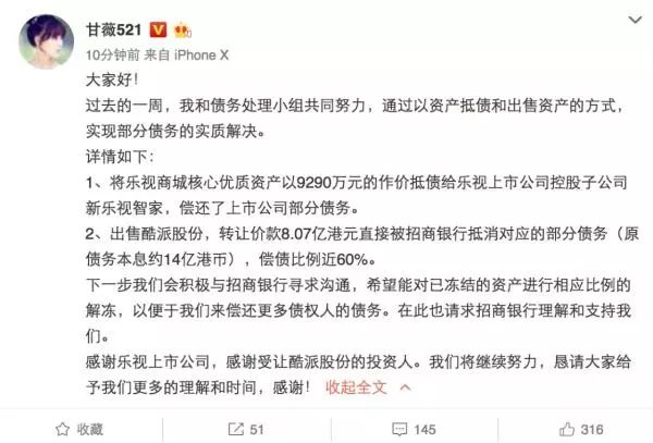 1月7日,贾跃亭妻子甘薇发布微博,介绍了债务处理进展,称通过以资产抵债和出售资产的方式,实现部分债务的实质解决。一是将乐视商城资产以9290万元的作价抵债给乐视上市公司控股子公司新乐视智家,偿还了上市公司部分债务;二是出售酷派股份,转让价款8.07亿港元直接被招商银行抵消对应的部分债务(原债务本息约14亿港币),偿债比例近60%。