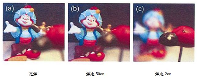 图4 使用液体透镜在定焦、50cm焦距、2cm焦距时对物体成像效果图