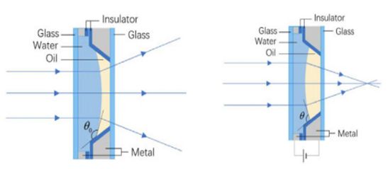 电润湿效应透镜,是通过改变施加的电压来控制液体在固体表面上的润湿特性的液体透镜。那么电润湿效应又是什么呢?简单来说就是通过电压来控制液滴的表面形状。更准确来说,电润湿效应是一种物理化学现象,通过改变液体-固体界面的外加电压来控制液体在固体面上的润湿特性,从而改变液滴的接触角,使其能像人眼的晶状体一样改变曲率实现变焦。同时,对施加电压的不同,其表面曲率会发生变化,从而实现光学变焦。
