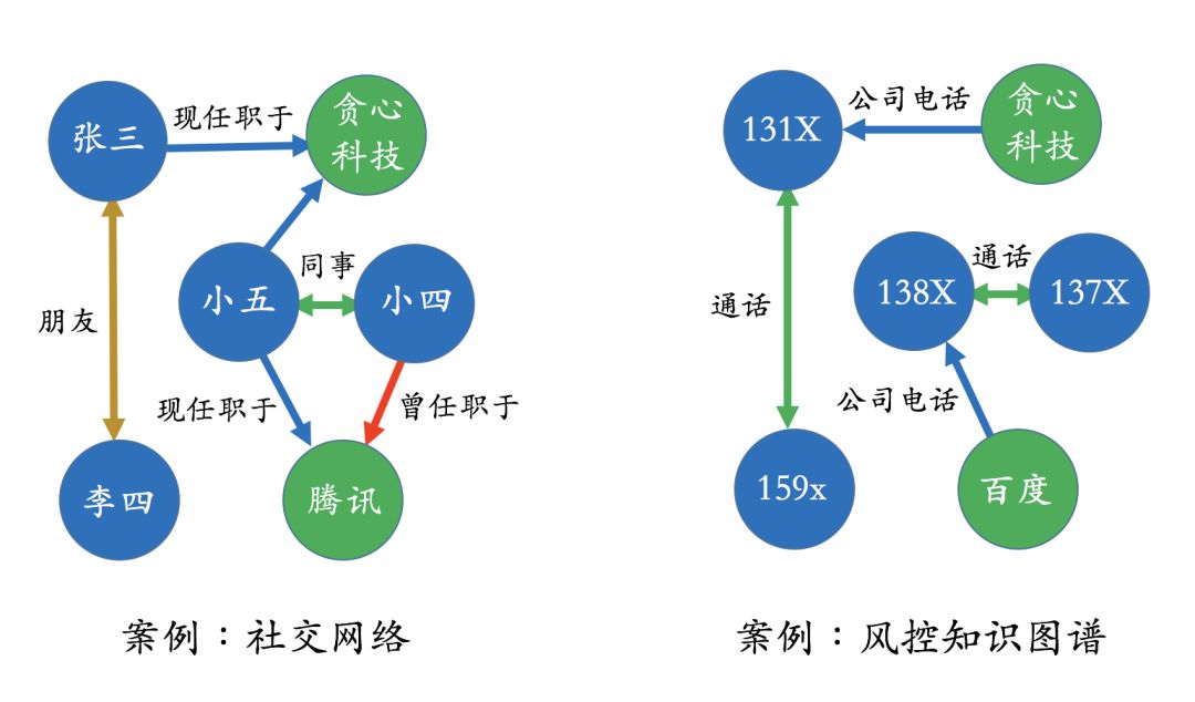 现实世界中的很多场景非常适合用知识图谱来表达。 比如一个社交网络图谱里,我们既可以有“人”的实体,也可以包含“公司”实体。人和人之间的关系可以是“朋友”,也可以是“同事”关系。人和公司之间的关系可以是“现任职”或者“曾任职”的关系。 类似的,一个风控知识图谱可以包含“电话”、“公司”的实体,电话和电话之间的关系可以是“通话”关系,而且每个公司它也会有固定的电话。
