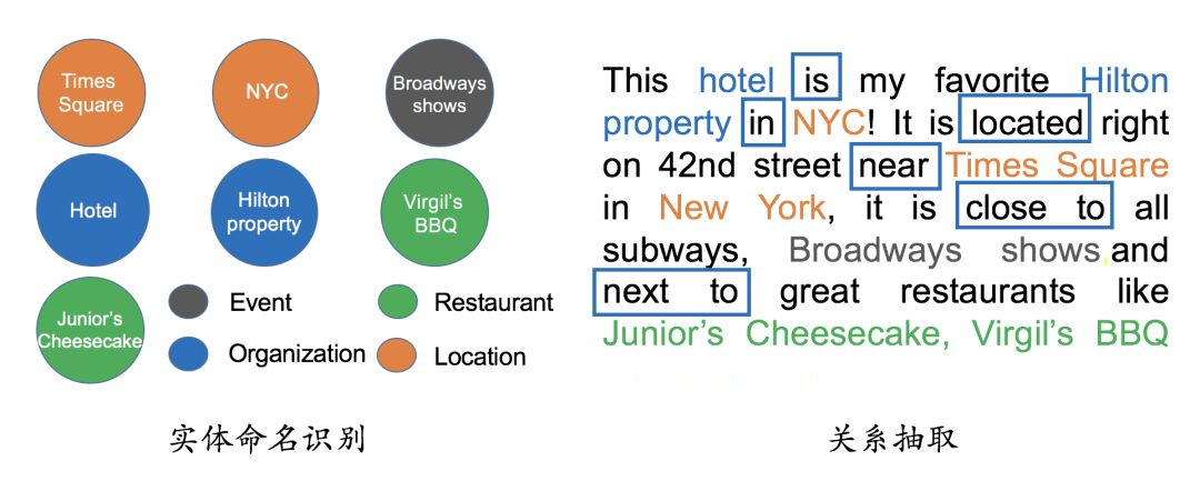 首先是实体命名识别,就是从文本里提取出实体并对每个实体做分类/打标签:比如从上述文本里,我们可以提取出实体-“NYC”,并标记实体类型为 “Location”;我们也可以从中提取出“Virgil's BBQ”,并标记实体类型为“Restarant”。这种过程称之为实体命名识别,这是一项相对比较成熟的技术,有一些现成的工具可以用来做这件事情。其次,我们可以通过关系抽取技术,把实体间的关系从文本中提取出来,比如实体“hotel”和“Hilton property”之间的关系为“in”;“hotel”和“Time Square”的关系为“near”等等。