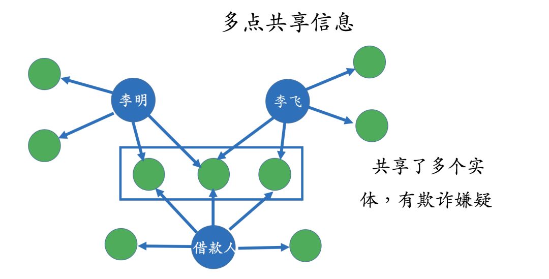 这种方法比较适用于找出团体欺诈,它的核心在于通过一些模式来找到有可能存在风险的团体或者子图(sub-graph),然后对这部分子图做进一步的分析。 这种模式有很多种,在这里举几个简单的例子。 比如在下图中,三个实体共享了很多其他的信息,我们可以看做是一个团体,并对其做进一步的分析。