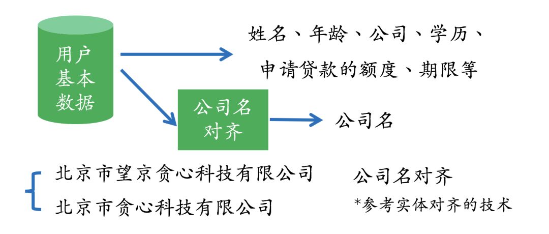举个例子,对于用户的基本信息,我们很可能需要如下的操作。一方面,用户信息比如姓名、年龄、学历等字段可以直接从结构化数据库中提取并使用。但另一方面,对于填写的公司名来说,我们有可能需要做进一步的处理。比如部分用户填写“北京贪心科技有限公司”,另外一部分用户填写“北京望京贪心科技有限公司”,其实指向的都是同一家公司。所以,这时候我们需要做公司名的对齐,用到的技术细节可以参考前面讲到的实体对齐技术。
