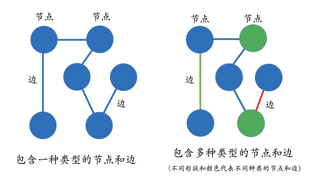 那什么叫多关系图呢? 学过数据结构的都应该知道什么是图(Graph)。图是由节点(Vertex)和边(Edge)来构成,但这些图通常只包含一种类型的节点和边。但相反,多关系图一般包含多种类型的节点和多种类型的边。比如左下图表示一个经典的图结构,右边的图则表示多关系图,因为图里包含了多种类型的节点和边。这些类型由不同的颜色来标记。
