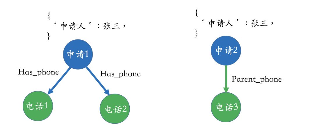 举个例子,可以观察一下下面这个图谱,并试问自己背后的业务逻辑是什么。通过一番观察,其实也很难看出到底业务流程是什么样的。做个简单的解释,这里的实体-“申请”意思就是application,如果对这个领域有所了解,其实就是进件实体。在下面的图中,申请和电话实体之间的“has_phone”,“parent phone”是什么意思呢?