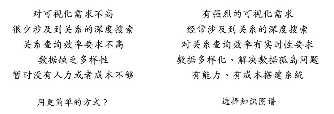 在进入下一个话题的讨论之前,要明确的一点是,对于自身的业务问题到底需不需要知识图谱系统的支持。因为在很多的实际场景,即使对关系的分析有一定的需求,实际上也可以利用传统数据库来完成分析的。所以为了避免使用知识图谱而选择知识图谱,以及更好的技术选型,以下给出了几点总结,供参考。
