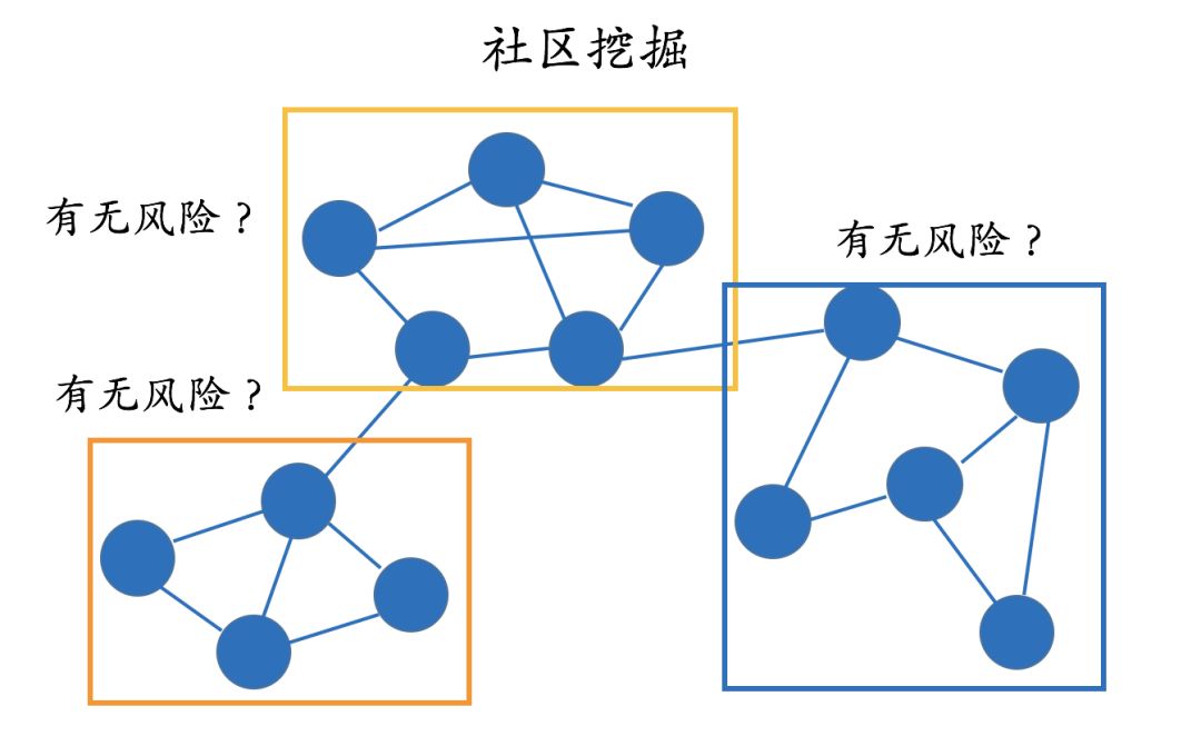 社区挖掘算法的目的在于从图中找出一些社区。对于社区,我们可以有多种定义,但直观上可以理解为社区内节点之间关系的密度要明显大于社区之间的关系密度。下面的图表示社区发现之后的结果,图中总共标记了三个不同的社区。一旦我们得到这些社区之后,就可以做进一步的风险分析。