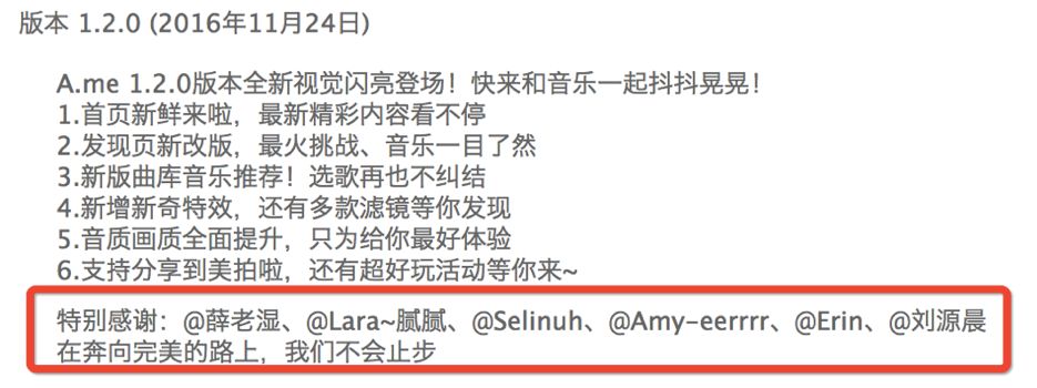 ▲ 抖音在早期的版本更新记录中对用户进行感谢