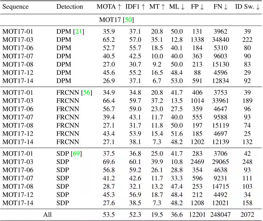 可以看到,DPM、FRCNN 和 SDP 三种检测器输入下的性能差距不大,然而 DPM 检测器的性能是很差的,所以 Tracktor++ 这类算法对于平衡检测输入的效果提升很大。