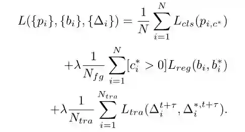 当然,跟踪分支只考虑与 gt 的 IOU>0.5 的预测框,并且目标要同时出现在这两帧。多任务损失函数如下: