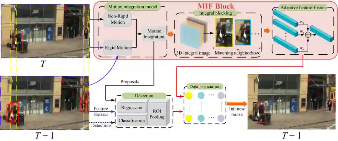 这篇文章也是基于 Tracktor++ 的模式,做了很直接的一步操作,即直接增加一个光流预测分支,将 Tracktor++ 中的 跟踪框+观测框 变成了 光流预测框+观测框