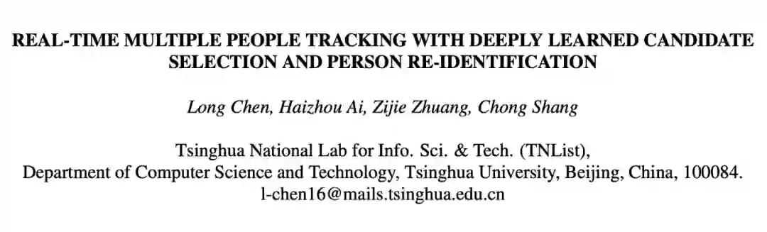 [2] Chen L, Ai H, Zhuang Z, et al. Real-time multiple people tracking with deeply learned candidate selection and person re-identification[C]. in: 2018 IEEE International Conference on Multimedia and Expo (ICME). IEEE, 2018. 1-6.