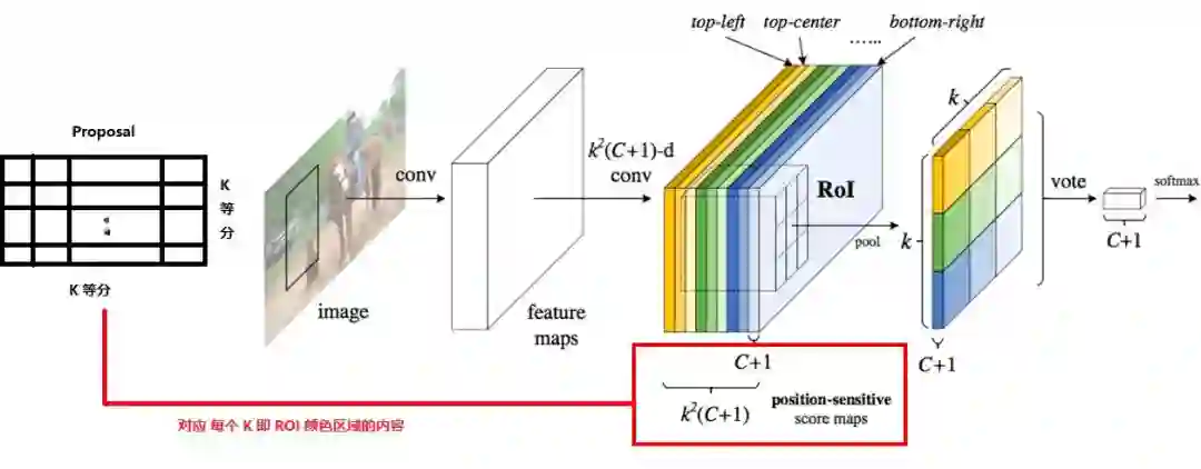 不同于传统两阶段目标检测框架利用全连接网络分支预测分类和回归的情况,R-FCN 通过全卷积的方式将分类得分转化到特征图通道上,使得特征图保持了一定的平移不变性(这个可以看我之前的博客),有利于跟踪任务的相关滤波。