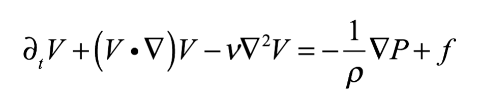 上面这个看起来十分冗长的等式便是描述流体运动的纳维尔-斯托克斯方程。流体,简单说来,就是运动的连续粒子流。正如牛顿第二定律 (F=ma) 描述了粒子在力的作用下如何运动一样,纳维尔-斯托克斯方程描述了粘性、不可压缩流体的运动。它并不是在表述能量守恒,而是描述流体在给定的粘度、集体速度和外部压强下是如何运动的。