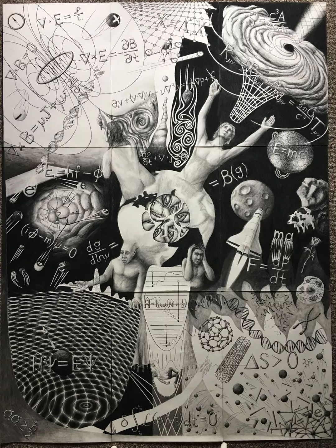 图的正中是人类和孕育人类生命的地球。地球上的四个人则表现了人类面对这四个不同尺度与复杂性的领域时,截然不同的态度:左上角的人拿着笔,陶醉于电动力学的完美,右上角的人满含热情与虔诚地拥抱宇宙的奥秘,右下角的人面对复杂的世界充满困惑,左下角的人震惊于微观量子世界的怪异。