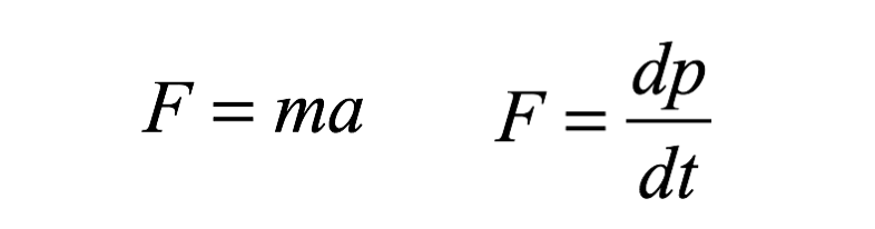 在牛顿第二定律F=ma下方,是作用于物体上的力的更为普适的表达。这个公式表达的是,作用于物体上的力等于单位时间内物体动量的变化。这种表达之所以更为普适,是因为它不仅包含了特定质量物体速度变化的可能,还包含了物体质量变化的可能。因为动量由质量和速度共同决定,这两者中任何一种的变化,都意味着有力作用于物体上。