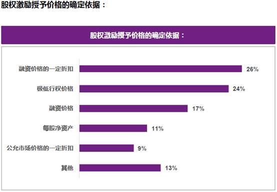 在授予价格方面,部分企业采用“极低行权价格”作为股权激励的授予价格,这与公司在发展的早期阶段授予股权激励有一定的关系。此外,还有相当比例的公司采用“融资价格”或者“融资价格的一定折扣”作为股权激励的授予价格。市场上较为常见的股权激励授予价格为融资价格的30%-60% 。