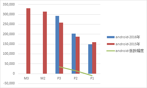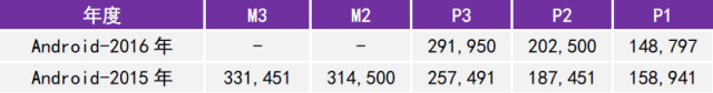 2016年与2015年Android开发岗实际总现金薪酬50分位对比: