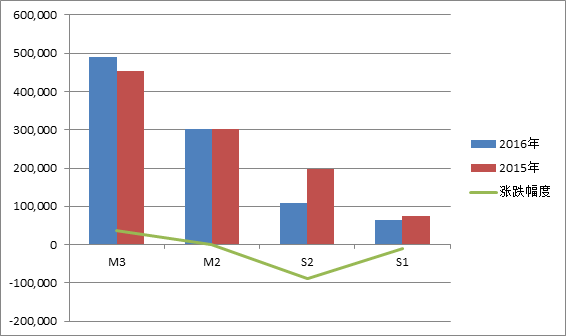 2016年与2015年市场营销类岗位实际总现金薪酬50分位对比: