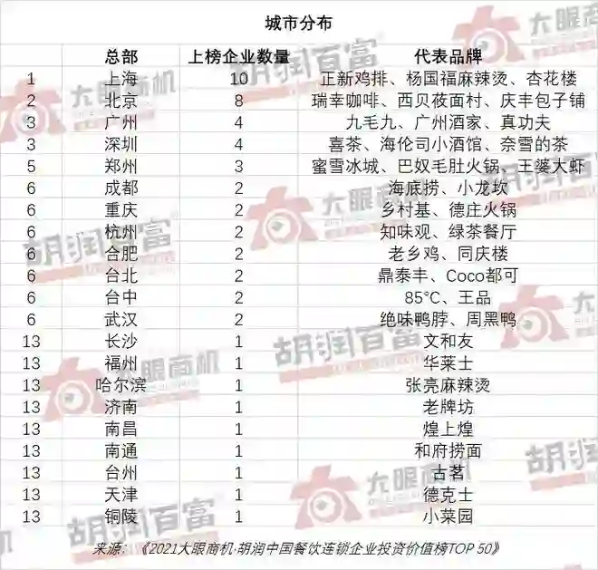 据创业邦统计,在2021年发布的《胡润中国餐饮连锁企业投资价值榜TOP50》中,总部位于北上广深一线城市的企业有26家,位于准一线及省会城市的企业有21家,另有总部位于台州的古茗,来自南通的和府捞面以及发源于铜陵的小菜园等榜上有名。