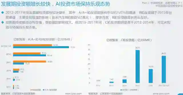 2. 发展期(A/A+轮、B轮)企业的获投频数稳步上升,并逐渐向初生期企业靠近,2017年表现更为显著。由此可以预测,2017年中国AI投资市场重心已开始向发展期转移。