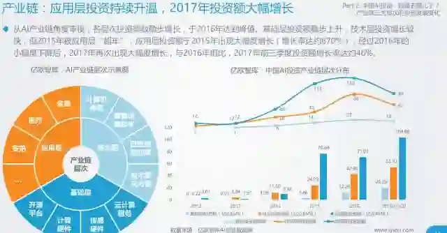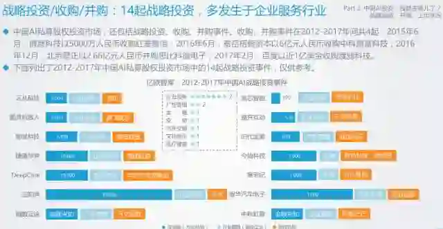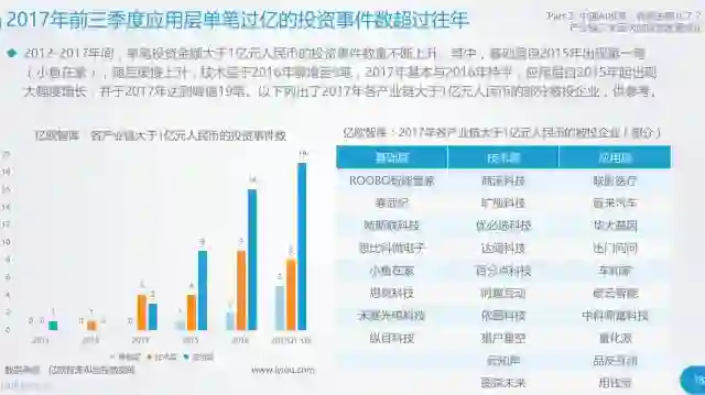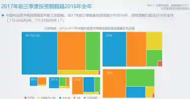 AI炙手可热。从各投资阶段投资频数角度审视,中国AI投资市场各阶段投资频数于2015年出现第一次大幅度增长;2017年前三季度投资频数虽低于2016年,但基于算数计算预估,2017年全年投资频数有望达到或略超过2016年。