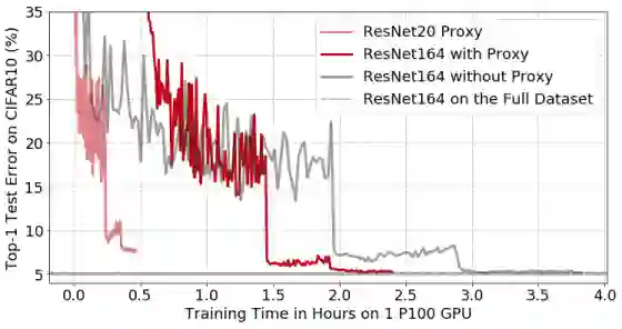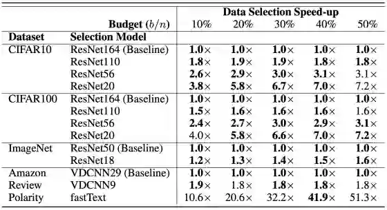 ,我们提出了一种将数据选择速度提高多达41.9倍的方法。我们使用一种规模较小、精度较差的模型作为规模较大目标模型的低代价的代理,并用此来选择用于训练的“核心”数据。尽管这些代理模型准确性较低,但它们选择的是不会对最终模型的准确性产生较大影响(通常在0.1%以内)的高质量数据。另外,在不影响ResNet-164模型准确性的情况下,上述代理模型可以清洗掉50%以上的CIFAR-10训练数据,从而使端到端模型的训练速度提升40%。