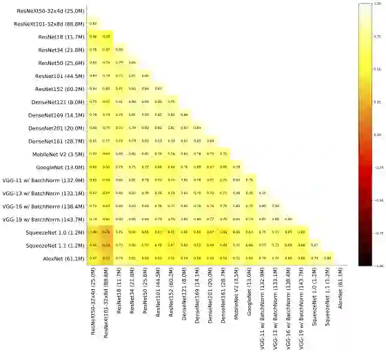 上图为在ImageNet数据集上PyTorch预训练模型与最大熵排名之间的Spearman相关性。大多数模型架构之间相关性很高。例如,MobileNet V2基于熵的排名与ResNet50模型高度相关,尽管该模型参数要少得多(3.5M vs 25.6M)。