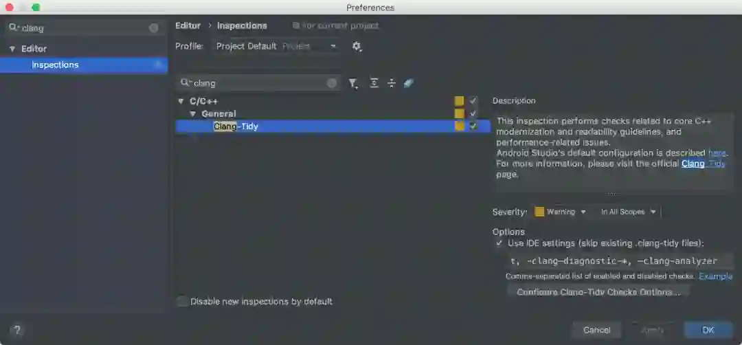 Clang-Tidy 支持 - 开发者现在可以在 Android Studio 现中使用 Clang-Tidy 对 C++ 代码进行静态分析。与 Studio 中用于检查 Java 和 Kotlin 代码的 lint 工具相似,Clang-Tidy 可以检测包含 C ++ 代码的 Android 应用中是否存在常见编码问题和错误。请依次勾选 Settings → Editor → Inspections (MacOS 中为 Preference → Editor → Inspections) ,开启该功能。更多内容,请参阅 Clang-Tidy 官方文档。