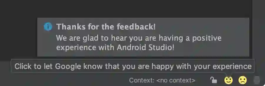IDE 用户反馈 - Android Studio 新添加了心情图标,帮助我们快速收集用户反馈,并用于改善产品质量。如果您已选择分享使用情况统计信息,请点击最能代表您当下使用体验的图标。如果您尚未启用分享使用情况统计信息,可以通过以下步骤予以启用: Settings → Appearance & Behavior → System Settings → Data Sharing (MacOS 中为 Preferences → Appearance & Behavior → System Settings → Data Sharing) 。