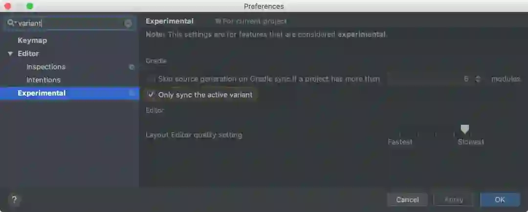 单变体项目同步 - 如果应用项目的规模较大,而且需要同时维护多个构建变体,那么除构建速度以外,项目的同步速度也有可能成为开发瓶颈。该版本 IDE 允许开发者限定仅同步当前所选的变体。如需使用该优化,请确保项目已添加 Android Grandle plugin 3.3.0 或更高版本。该功能为实验功能,您需要在 Android Studio 3.3 中的实验偏好设置中手动开启。
