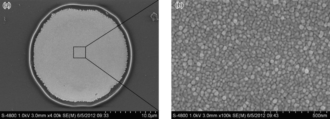 图8 为沉积纳米金后,超微电极的SEM 表征图及局部放大图,微观形貌表明,纳米金粒子已成功组装到电极的表面,粒径约为30nm,而且超微电极的电极结构未受到破坏。