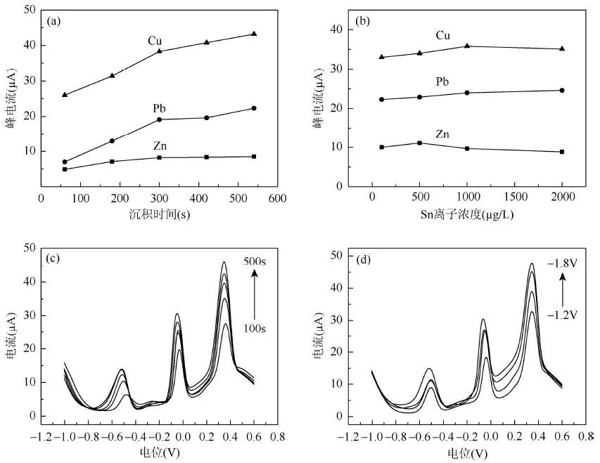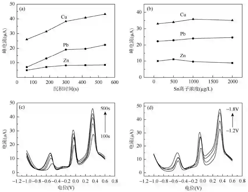 考察了纳米金沉积时间[图6(a)]、Sn 离子浓度[图6(b)]、富集时间[图6(c)]及富集电位[图6(d)]对500μg/L Cu(Ⅱ)、Pb(Ⅱ)和Zn(Ⅱ)标准溶液的方波溶出伏安响应的影响。