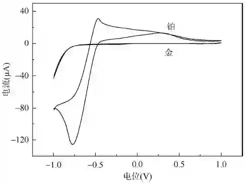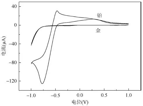 图4 铂电极和金电极在0.1mol/L 醋酸缓冲溶液(pH=4.5)中的循环伏安表征图