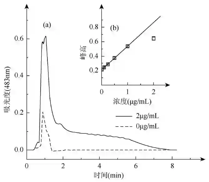 以日落黄为例,分光光度计所读取的洗脱曲线如图3(a)所示。曲线首先快速上升,出现明显的尖峰,随后缓慢下降。说明大部分离子液体是由有机溶剂的最初段冲洗下来的,其中携带了大部分的待测物日落黄。将吸光度峰值与日落黄浓度作图可得在线系统的分析曲线如图3(b)所示。
