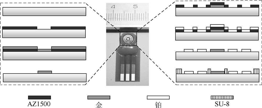采用标准MEMS 工艺在玻璃基底上制备微传感电极芯片,制备过程及封装好的电极照片如图5 所示。采用了光刻、溅射、剥离等标准微纳米加工工艺,工作电极为金电极,对电极和准参比电极为铂电极。电极芯片系统采用“圆-圆环-圆环”同心式分布,具有电极表面电位和电场分布均匀的特点。该结构的电场与电极表面溶液扩散方向一致,可较好地抑制电流噪声,改善传感器的响应性能。为了精确控制工作电极的敏感面积,采用SU-8 层为绝缘层,绝缘后芯片中心圆形工作电极面积为1mm2。后经划片、金丝球压焊和封装,制得重金属微传感电极芯片。电化学检测实验均在三电极体系下完成,工作电极和对电极为采用MEMS技术制备的微传感电极,由于芯片上的准参比电极不能维持准确的电极电位,采用外置的饱和甘汞电极或饱和Ag/AgCl 电极作为参比电极。