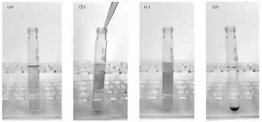 (a)含有待萃取物(苏丹红)的饱和离子液体原液;(b)加入高氯酸钠瞬间;(c)混合均匀的乳浊液;(d)离心后
