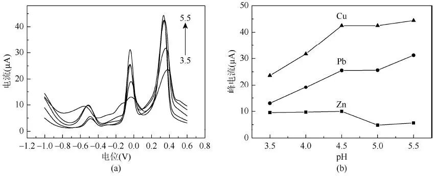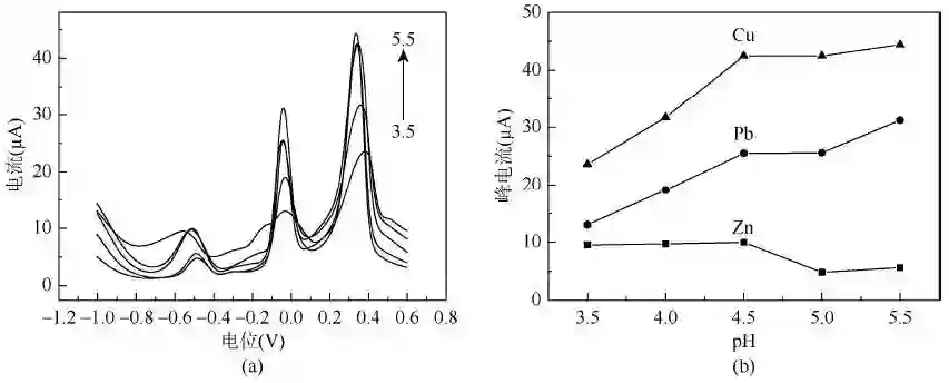 (a)不同酸度下的溶出伏安曲线;(b)不同酸度与峰电流的关系图