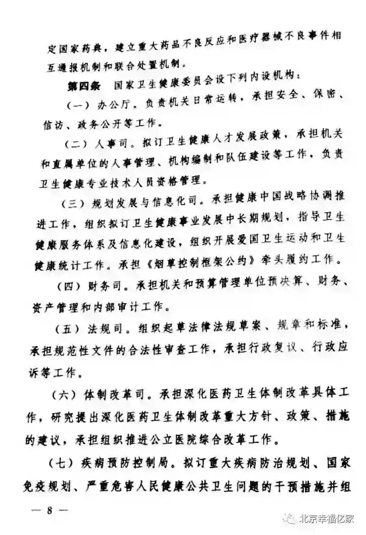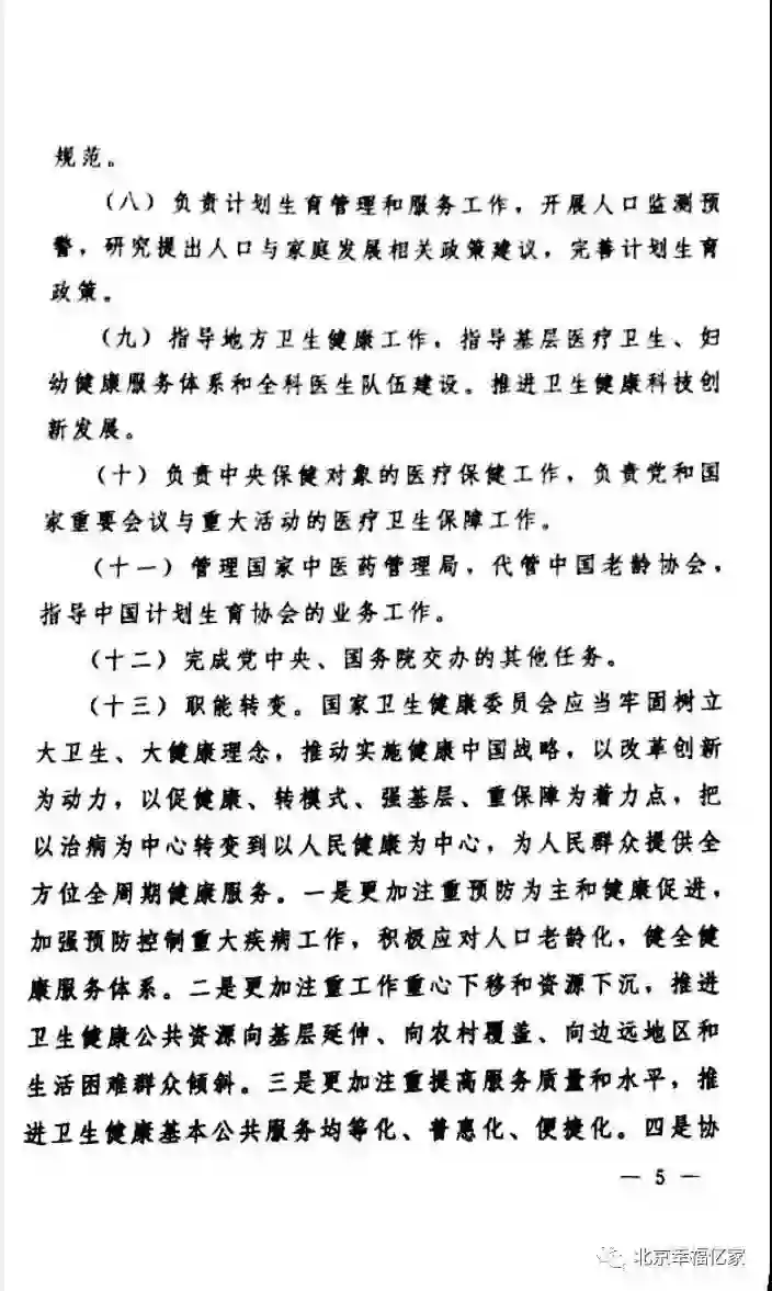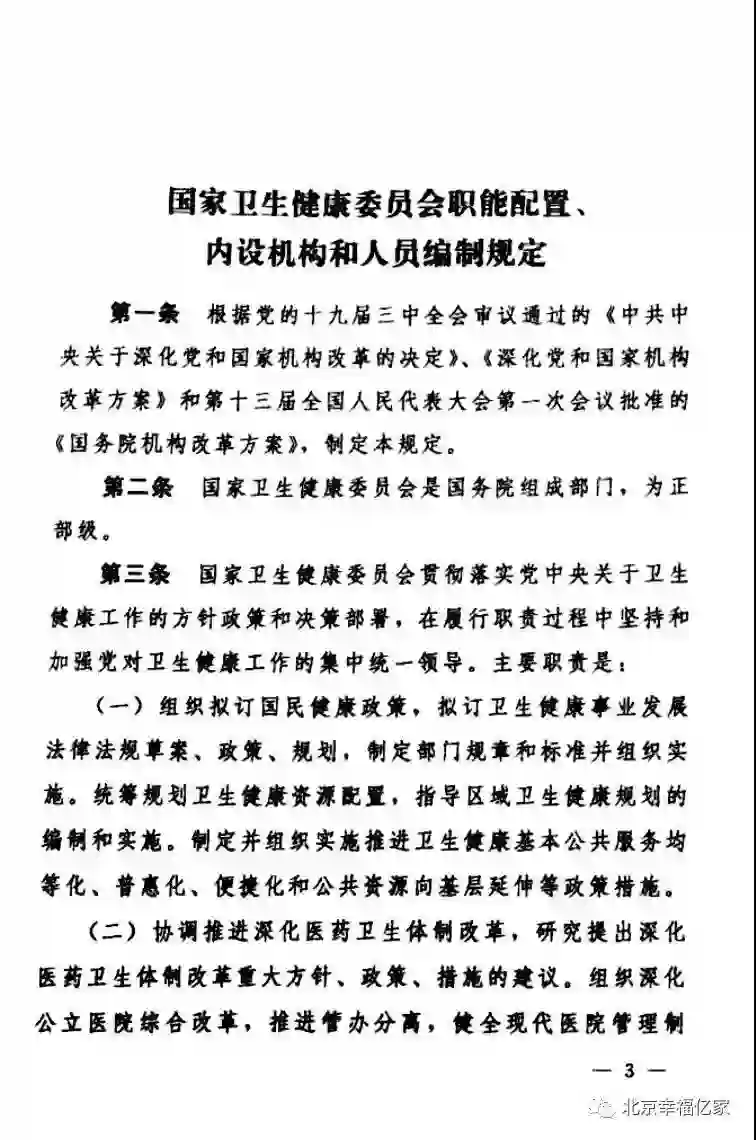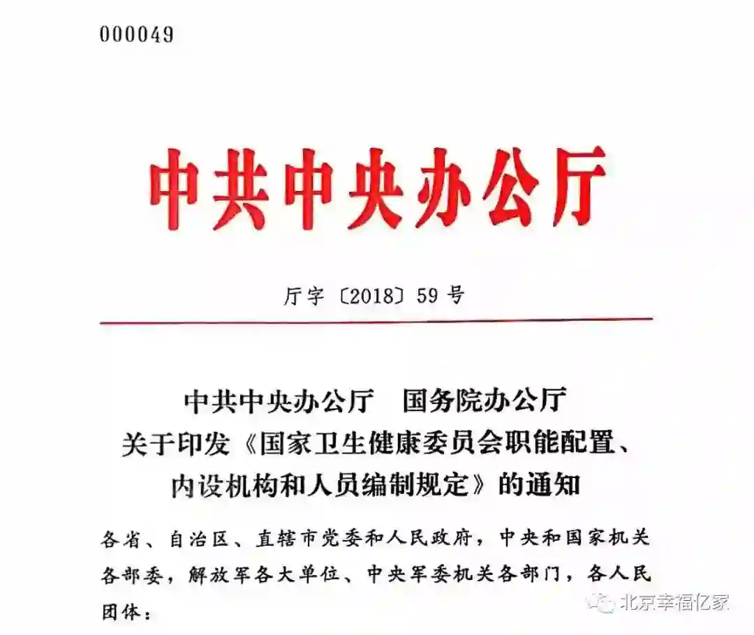 近日,一份由中共中央办公厅、国务院办公厅关于印发《国家卫生健康委员会职能配置、内设机构和人员编制规定》的通知在网间流传,根据该通知,大家关注的国家卫生健康委员会三定方案已确定并正式印发。