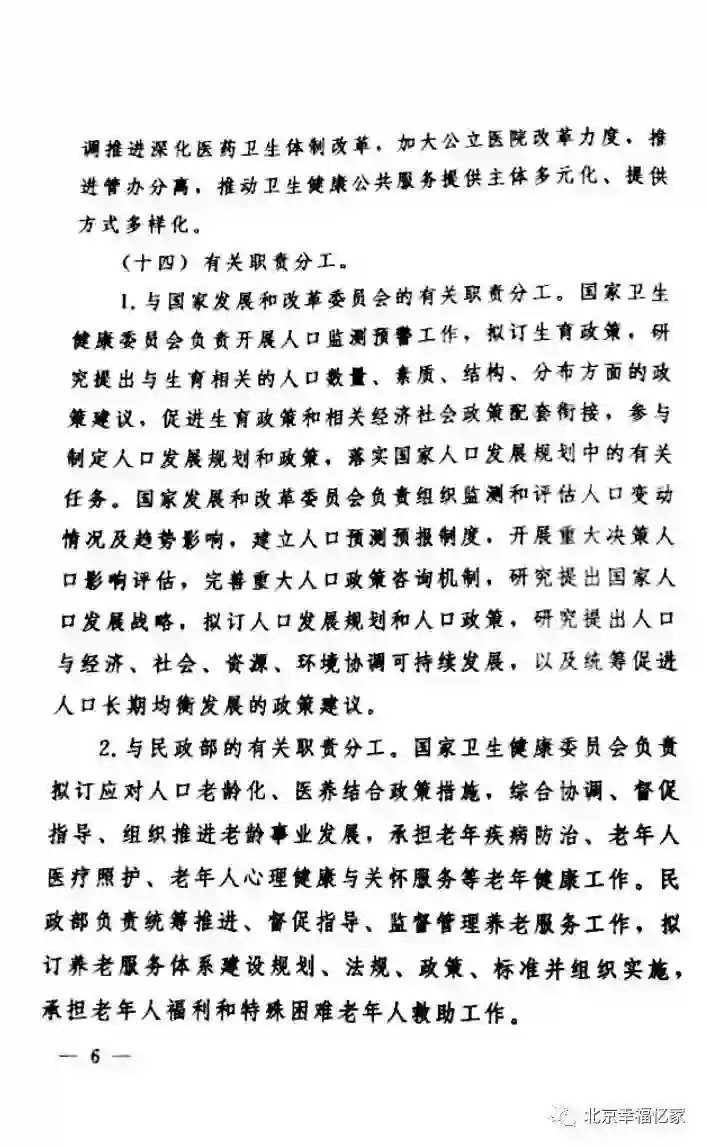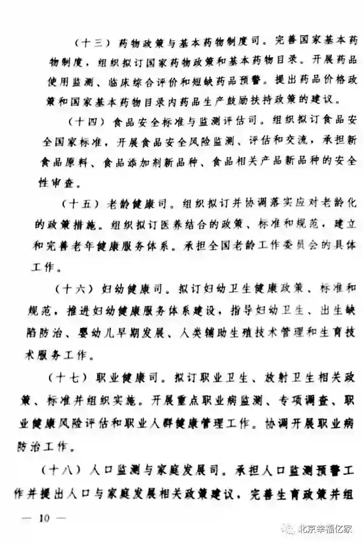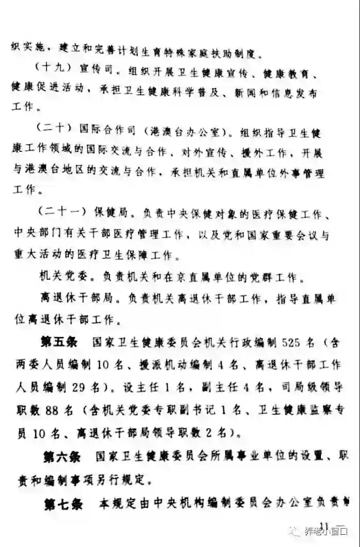 十五、老龄健康司。组织拟订并协调落实应对老龄化的政策措施。组织拟订医养结合政策、标准和规范,建立和完善老年健康服务体系。承担全国老龄工作委员会的具体工作。(新组建)