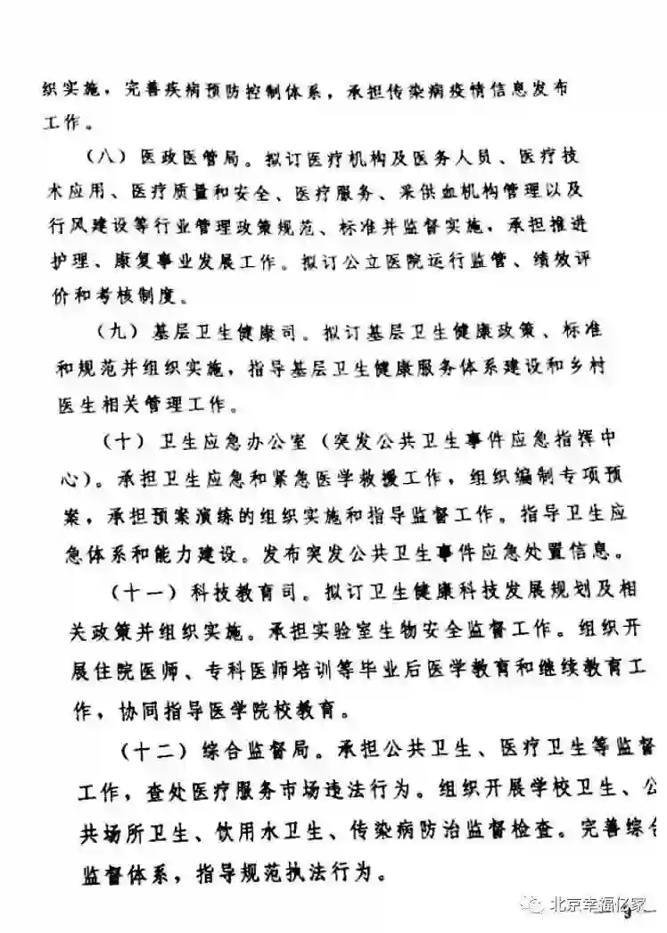 八、医政医管局。拟订医疗机构及医务人员、医疗技术应用、医疗质量和安全、医疗服务、彩供血机构管理以及行风建设等行业管理政策规划、标准并监督实施,承担推进护理、康复事业发展工作。拟订公立医院运行监管、绩效评价和考核制度。(原有)
