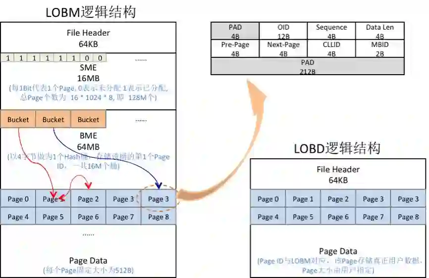 在巨杉数据库中,LOB存储结构分为元数据文件(lobm)与数据文件(lobd)。其中,元数据文件存储整个LOB数据文件的元数据模型,包括每个页的空闲状况、散列桶、以及数据映射表等一系列数据结构。而数据文件则存储用户真实数据,数据头之后所有数据页按照page size进行切分,每个数据页不包含任何元数据信息。