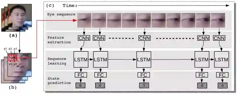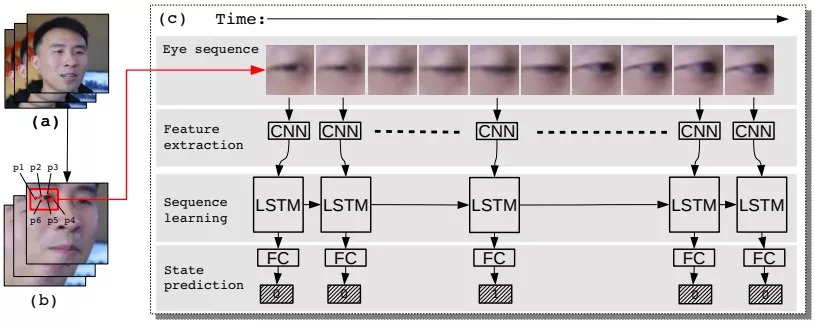 其中特征提取模块(第二行)负责把输入的眼部图像转成神经网络可以“理解”的特征,这是个基于VGG16架构的CNN。序列学习模块(第三行)由RNN和LSTM构成,LSTM-RNN的使用是为了增加模型的信息存储量,避免在使用随时间反向传播(BPTT)算法时出现梯度消失。最后一个模块——状态预测,由全连接层构成,它输入LSTM的输出,并用一个概率预测是睁眼(0)还是闭眼(1)。