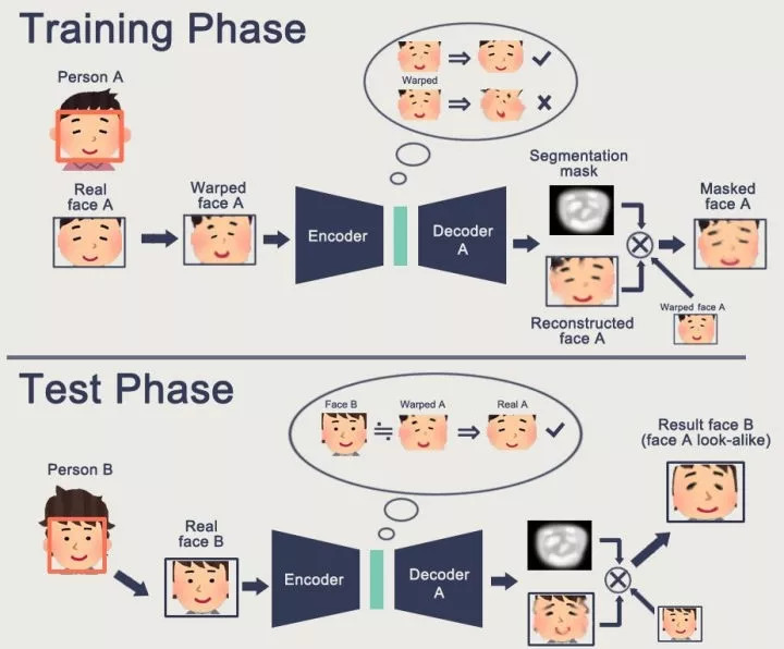 上图是对神经网络训练、测试过程的细化图解。看罢视频,也许有人会有疑问:为什么Deepfake生成的假脸会这么自然?这是因为在训练期间(Training Phase),我们会先把目标人物A的脸抠出来,定位好五官位置,训练一个无论如何扭曲A的脸,最后都能生成正常A脸的网络。