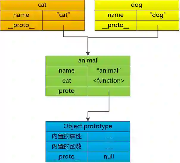 对象dog 的原型是animal (注意:也是一个对象), 对象cat的原型也是animal 。