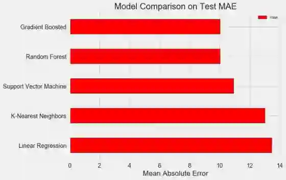 梯度增强回归(MAE = 10.013)略优于随机森林(MAE = 10.014)。这些结果并不完全公平,因为我们主要使用了超参数的默认值。特别是在支持向量机等模型中,性能高度依赖于这些设置。最终,从这些比较的结果中,我们将选择梯度增强回归(gradient boosted regressor)模型来进行模型优化。