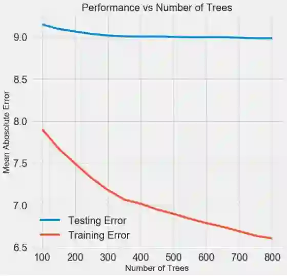 随着模型使用的树的数量增加,训练和测试的误差都会减少。 但是,训练误差比测试误差下降得快得多,我们可以看到我们的模型过拟合了:它在训练数据上表现非常好,但在测试集上无法达到相同的性能。
