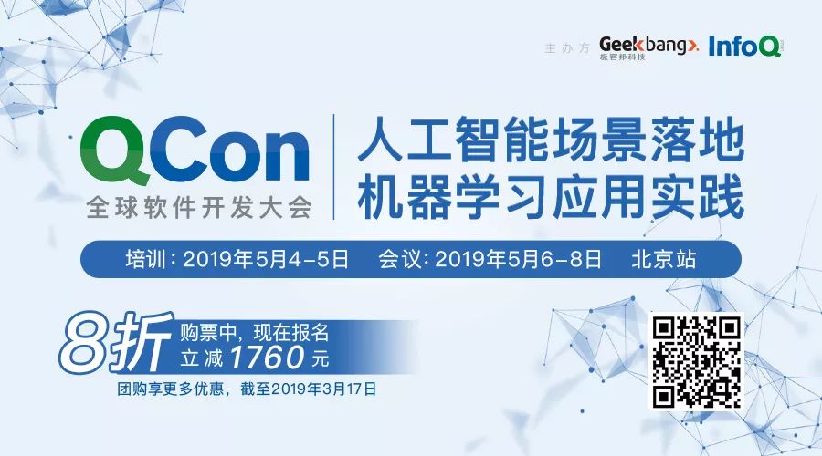 在 AI 高速发展的第七个年头,以深度学习为基础的新一代 AI 技术正趋向切实业务尝试。2019 年 5 月 6-8 日,QCon 特邀行业内场景落地专家与你相约北京国际会议中心,深度聚焦人工智能技术、机器学习应用与实践等专题。点击 「 阅读原文 」或识别二维码了解 QCon 十周年精心策划,现在购票即享 8 折限时折扣,立减 1760 元,团购还有更多优惠!有任何问题欢迎联系票务小姐姐 Ring:电话 010-53935761,微信 qcon-0410
