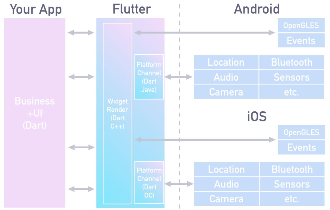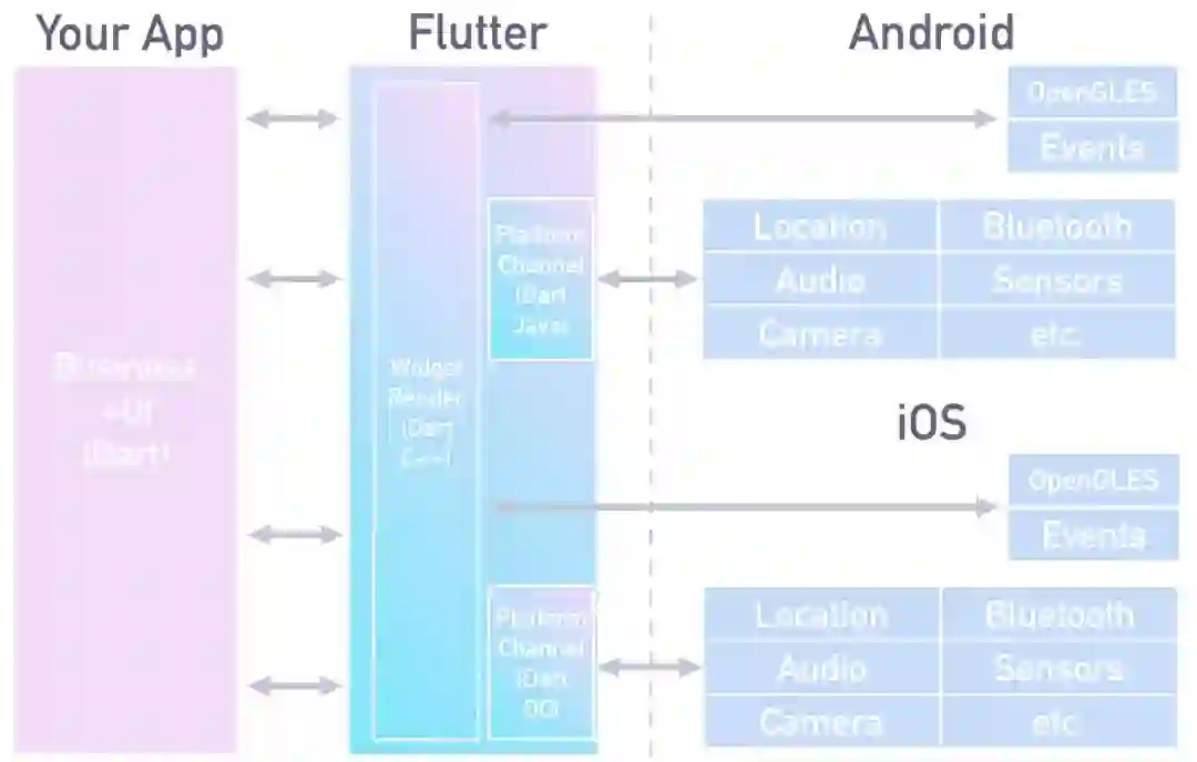 首先第一点,也是最本质的区别:Flutter 使用系统级 API 进行渲染,客户端仅需要提供一块画布就可以支持应用展示。这一点使其脱离了原生的渲染,让我们可以获得高度一致的渲染体现。除了一致性以外,Flutter 大量利用了 GPU 绘制的 Skia 图形引擎,在渲染速度和动画效果上都给出了更有体验。