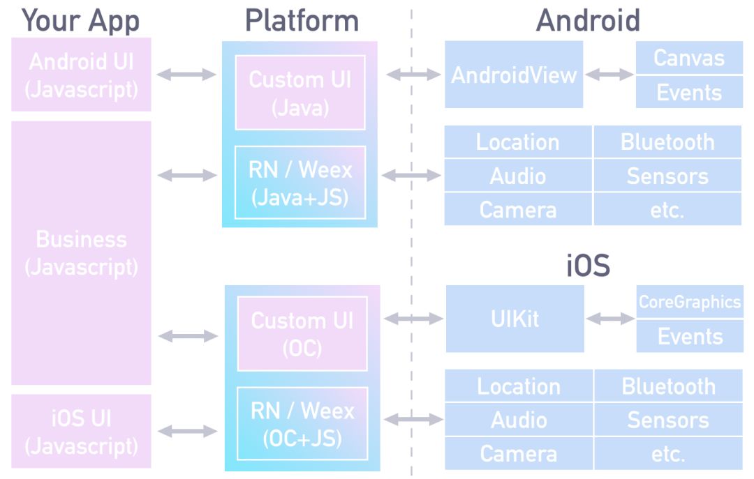 Facebook 在推出 React Native 的时候,一举高喊 ”Learn once, write anywhere“。React Native 的首要目的是让 React 框架在移动端开发中开花。其技术重点和难点在于使用 JavaScript 调用 Native 的组件,从而利用 JavaScript 实现原生的体验。